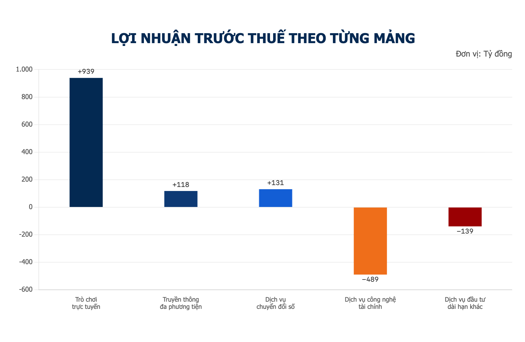 Mảng Dịch vụ chuyển đổi số (VNG Digital Business) cũng ghi nhận kết quả dương với 774 tỷ đồng doanh thu và 131 tỷ đồng lợi nhuận trước thuế. Ở chiều ngược lại, mảng Dịch vụ đầu tư dài hạn khác mang về 237 tỷ đồng doanh thu nhưng chịu mức lỗ trước thuế 140 tỷ đồng.