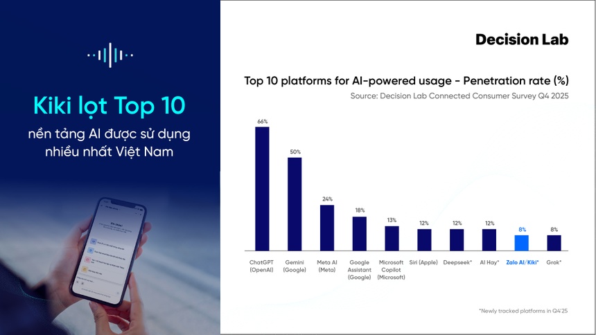 Trước đó, trong báo cáo thực trạng sử dụng AI với tầm nhìn hướng tới việc bình dân hóa AI tại Việt Nam được Decision Lab công bố vào tháng 8/2025, Kiki Info cũng là một trong những nền tảng AI lọt vào top được sử dụng nhiều nhất tại Việt Nam, sánh cùng ChatGPT, Gemini, Meta AI hay Copilot.